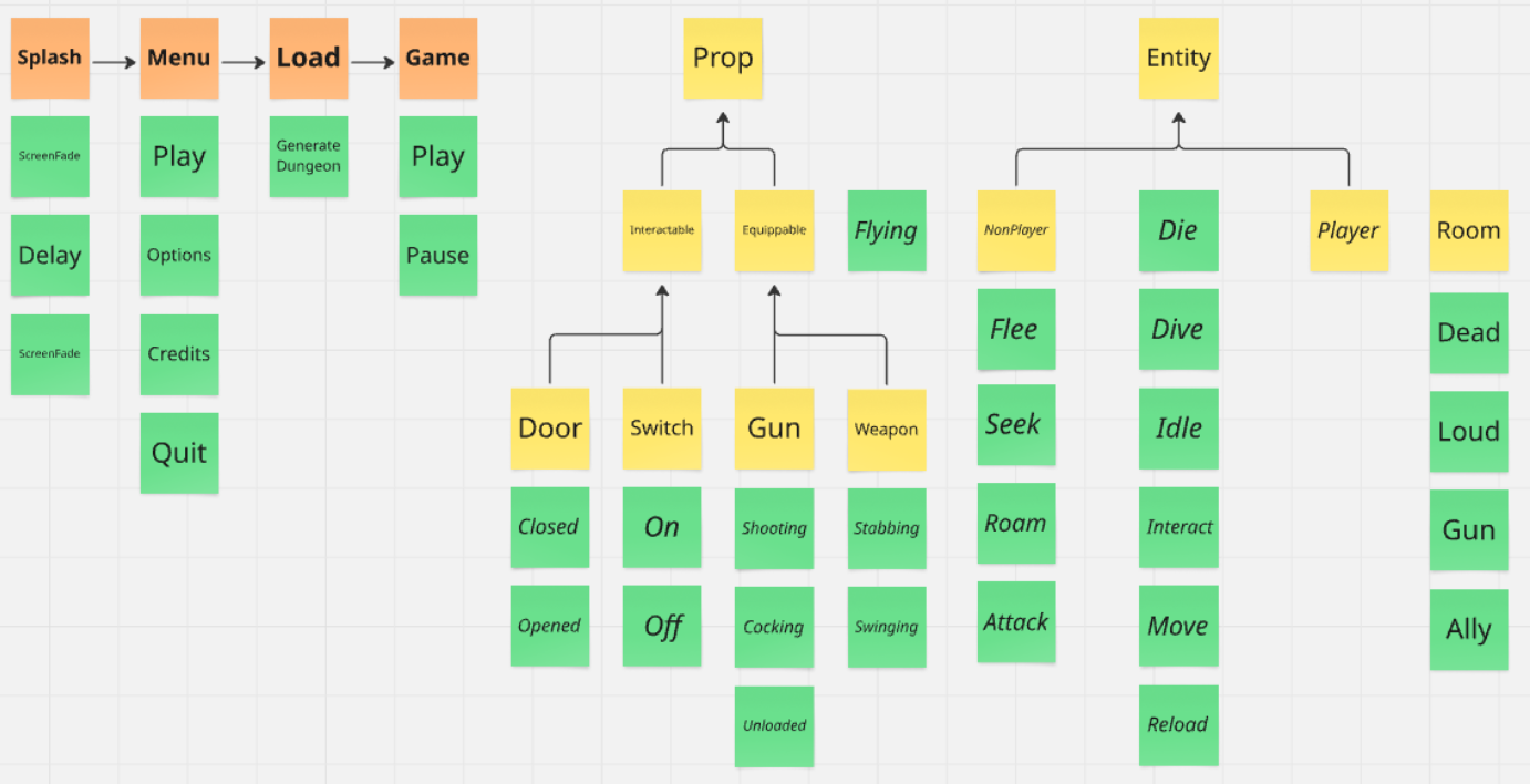 You can look at anything that loops over things as a logical state. Physics, animation, lighting, perhaps something like the modern Zelda games’ chemistry engine. You don’t need to get technical with your state breakdown, you only need to capture the different parts that will affect other states. The reason you want logical states included is that you will want to turn them on or off while other states are active.