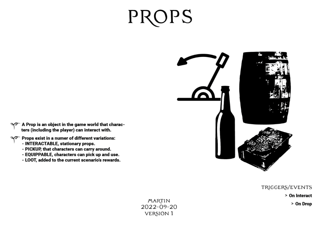 A prop is an object that can be held or acticated by a character. Think of movie or theater props and you get it. The most important breakdown for props concern limitations. Where you can activate it from, how many you can carry, etc. You shouldn’t specify the details at this point, only set up which limitations you want to have in your game.