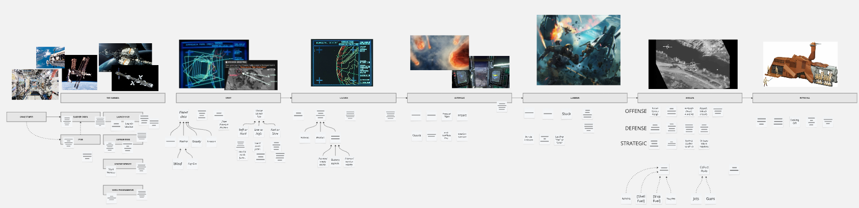 In the example from Killshell, many of the states (The Carrier, Orbit, and Launch) are menu states. But the other states, namely Interface, Landing, Mission, and Retrieval are composed of gameplay. These are referred to as simulation states, since they will be running the game’s full realtime simulation. Whatever this means for your game.