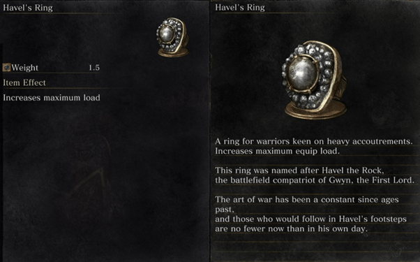 Havel’s Ring, from Dark Souls 3, provides effects in the game—but the “lore” of the item also provides flavor.