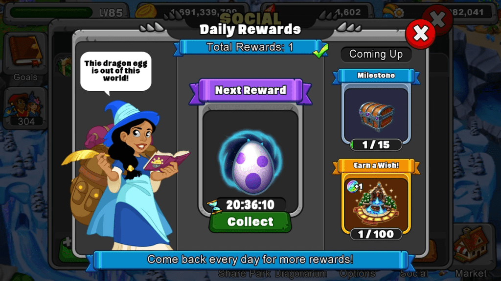 The daily reward screen in the mobile game DragonVale.