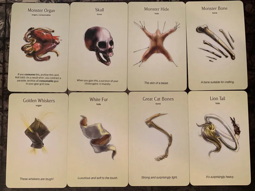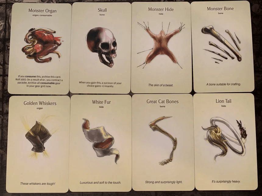 The somewhat morbid resources you pick up from slain monsters in Kingdom Death: Monster.